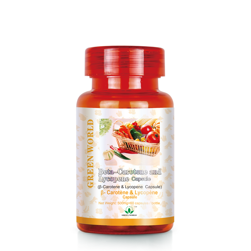 Green World Beta-Carotene and Lycopene Capsule contains β-carotene and lycopene. β-carotene is provitamin A carotenoid because it can be cleaved by the intestinal enzyme into vitamin A, which accelerates the cell division, body growth, and renewal of epithelial tissue. It is also essential for protection of eyesight. Lycopene is an antioxidant. Sufficient intake of lycopene has been associated with a reduced risk of cancer, cardiovascular disease and macular degeneration.